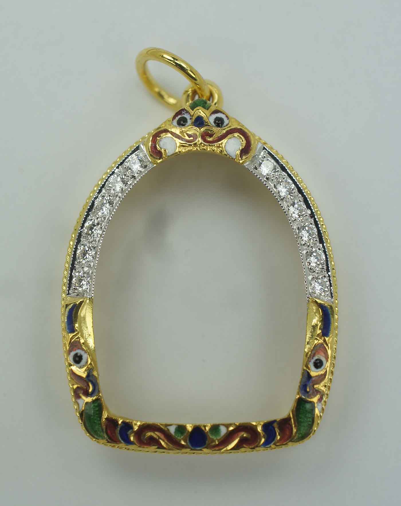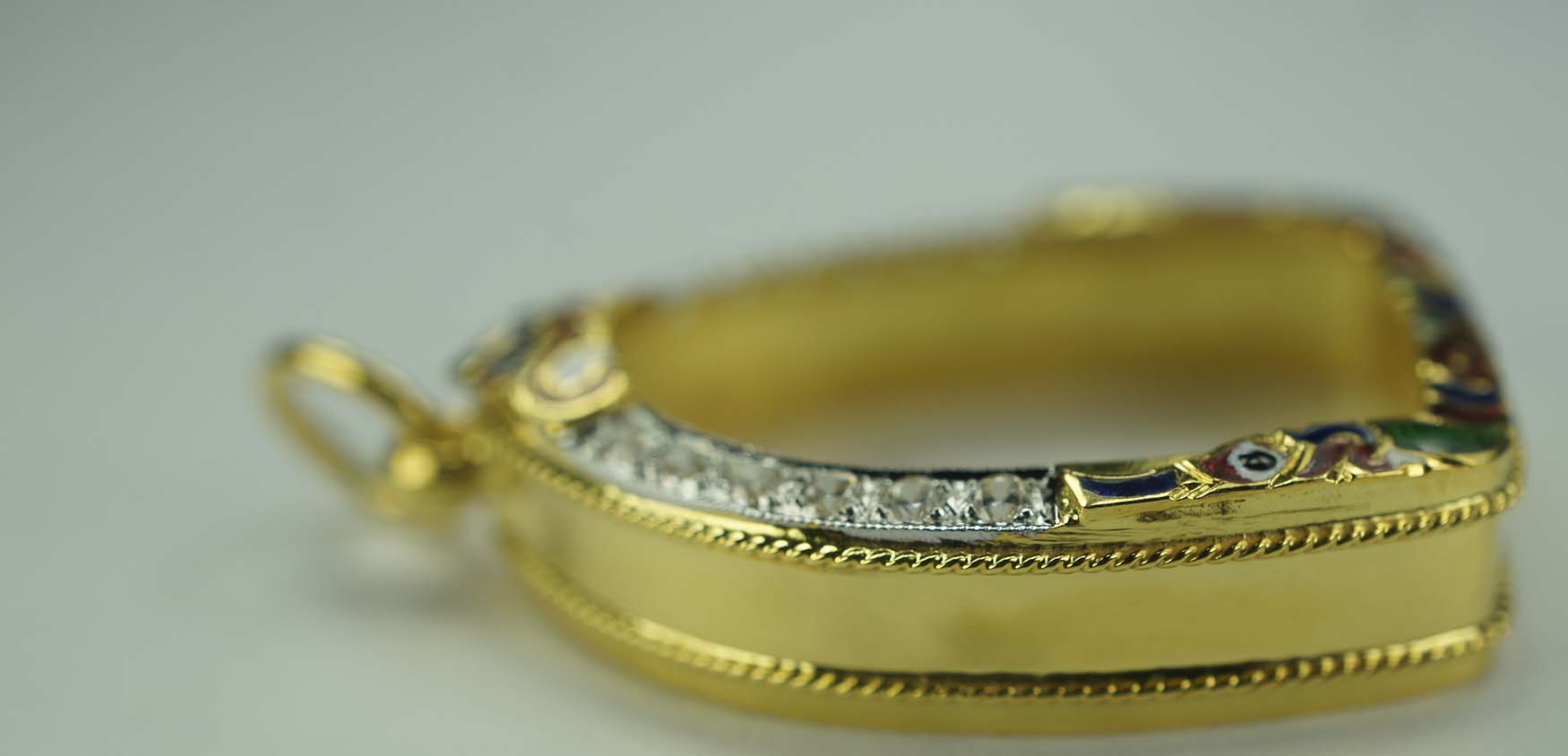กรอบทองฝังเพชร ลงยายกซุ้ม หัวสิงห์ ข้างเกลียวโปเต้ 2 เส้น ปัดเงา ใส่พระปิดตาอุตโม หลวงปู่ทิม วัดละหารไร่ ฝังเพชร CZ 12 เม็ด ขนาดวัดจากขอบด้านใน สูง 2.2 Cm. กว้างฐานล่าง 1.5 Cm. งานขึ้นมือ น้ำหนัก 3.98
