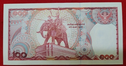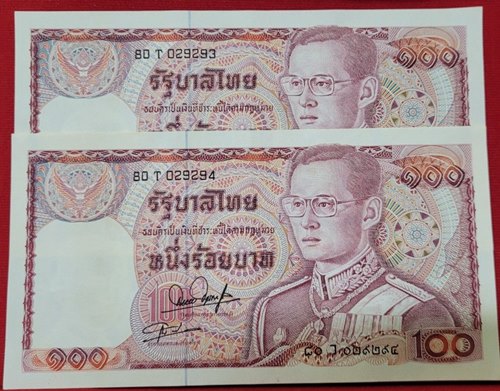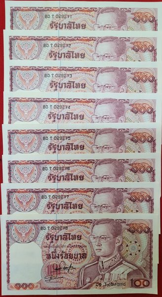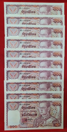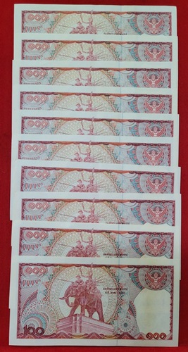 ธนบัตร 100 บาท ในหลวงรัชกาลที่ 9 แบบ 12 ด้านหลังช้างแดง เลข 6 หลัก หายาก จำนวน 10 ฉบับ เลขเรียง 8ฉบับ,และเลขเรียงกันอีก 2ฉบับ สภาพ UNC ใหม่,ไม่ได้ใช้,ไม่มีรอยพับ ลายเซ็น สมหมาย ฮุนตระกูล - กำจร สถิรกุล
