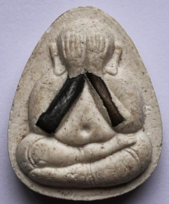 *****************สีพระในภาพแตกต่างจากสีพระจริงเล็กน้อย ปิดตา หมุดทอง ผิวพระด้านหน้าเป็นขุยทั้งองค์ มีตำหนิขอบขวา ฝากล่องสภาพชำรุดครับ |