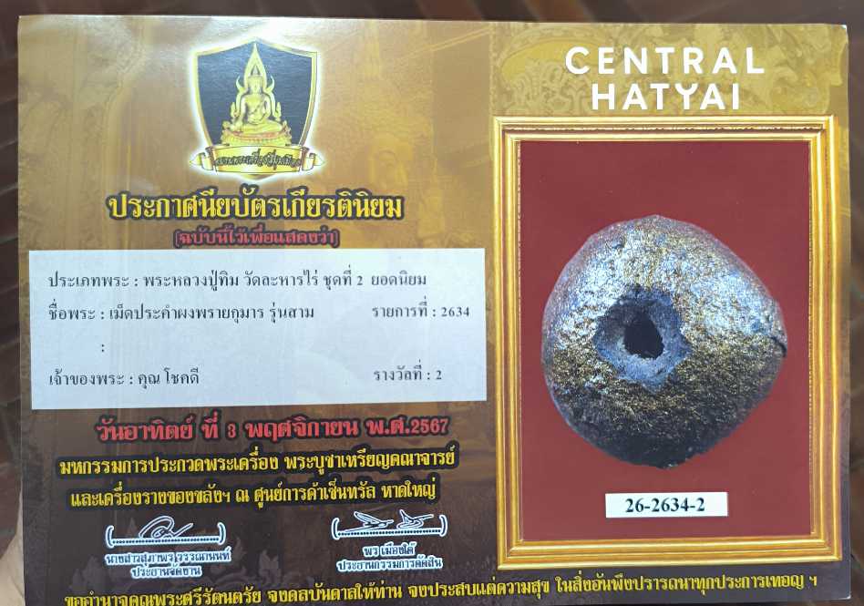 เม็ดประคำผงพรายกุมาร หลวงปู่ทิมพร้อมใบประกาศรางวัลที่2 งานเซ็นทรัลหาดใหญ่