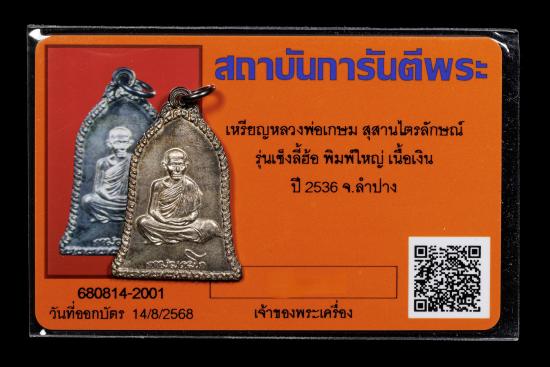 เหรียญเซ็งลี้ฮ้อ พิมพ์ใหญ่ หลวงพ่อเกษม สุสานไตรลักษณ์ ปี 2536 เนื้อเงิน จำนวนสร้าง 2,000 เหรียญ พร้อมบัตร Gpra