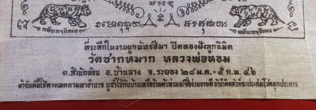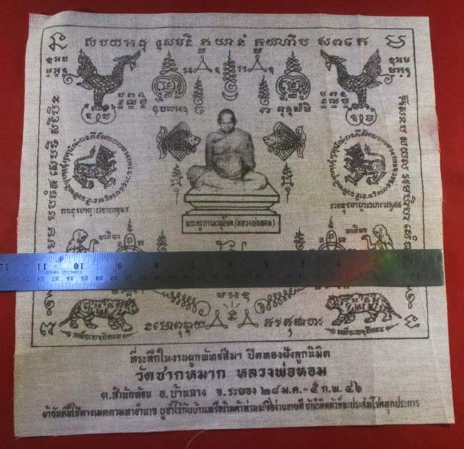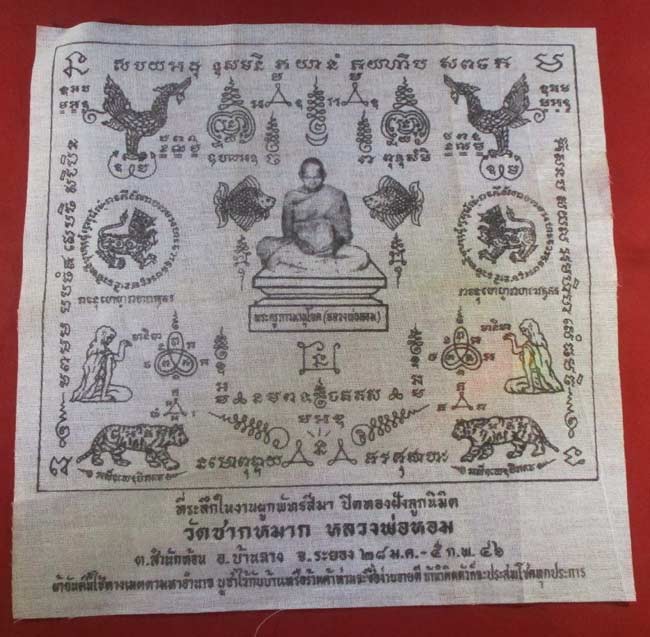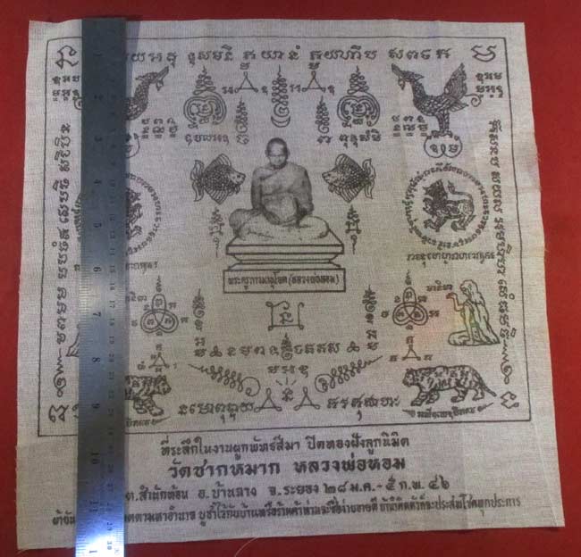 ผ้ายันต์ ที่ระลึกในงานผูกพัทธสีมา ปิดทองฝังลูกนิมิต วัดชากหมาก หลวงพ่อหอม จ.ระยอง ปี ๔๖ ครับ (พระบ้าาน ครับ) |