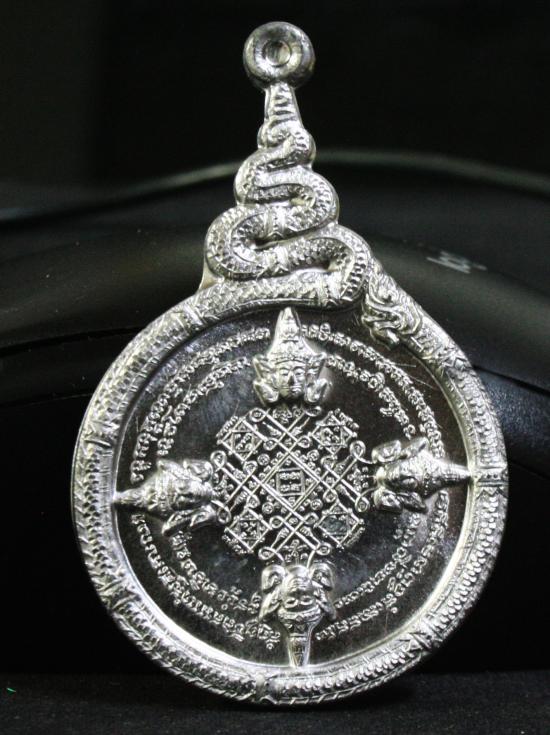 ด้านหน้าเหรียญได้นำพระยันต์ของพระพรหมที่เป็นตำรับเก่าแก่เป็นผูกกระดาษฝาง ที่ตกทอดกันมา ในตำราบอกบรรยายไว้มากมายสรุปได้อย่างนี้ว่า "ยันต์นี้ให้อธิษฐานตามแต่เธอจะปรารถนา จะคิดการสิ่งใด ก็สำเร็จเลิศเลอ ประเสริฐ ยิ่งนักแล" มีพญานาคขดล้อมยันต์พระพรหม ตวัดหางเป็นเลข ๙ เป็นสัญลักษณ์การเป่ายันต์พรหมครั้งที่ 9 ของหลวงพ่อ