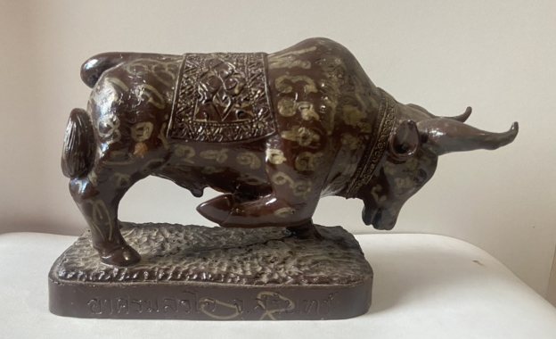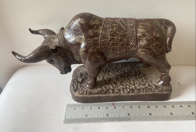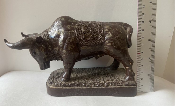 วัดใจเคาะเดียวแดงจ้า วัวธนูเนื้อเหล็กน้ำพี้หลวงปู่ทองคำ ขนาด5นิ้ว จารหมึกทอง เคาะเดียวแดงจ้า