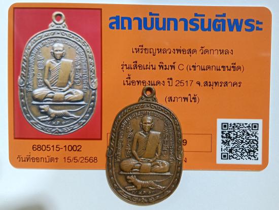 เหรียญหลวงพ่อสุด รุ่นเสือเผ่น พิมพ์C วัดกาหลง สมุทรสาคร ปีพ.ศ.2517+พร้อมบัตรฯ