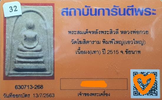 สมเด็จหลวงพ่อกวย ปี15 หลังพระสิวลี เนื้อผง(พิมพ์ใหญ่-เอวใหญ่) วัดโฆสิตาราม จ.ชัยนาท พร้อมบัตรรับรอง |