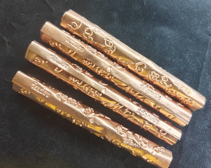 ตะกรุดร้อยช่อง เนื้อทองแดง จำนวน 4 ดอก หลวงพ่อพิเชฐ วัดโคกหม้อ ,ครูบากฤษดา สุเมโธ วัดสันพระเจ้าแดง ,หลวงปู่บุญส่ง ฐิตสาโร,หลวงปู่ดำ ทีปะธัมโมฯลฯ พุทธาภิเษก