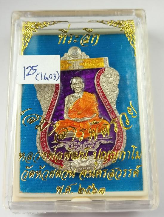 เหรียญเสมา "สารพัดรวย" หลวงพ่อพัฒน์ วัดห้วยด้วน เนื้อเงิน ลงยาขุ้ยพื้นสีม่วง (น้ำหนัก 16.03กรัม) เบอร์ 125 พร้อมกล่องครับ