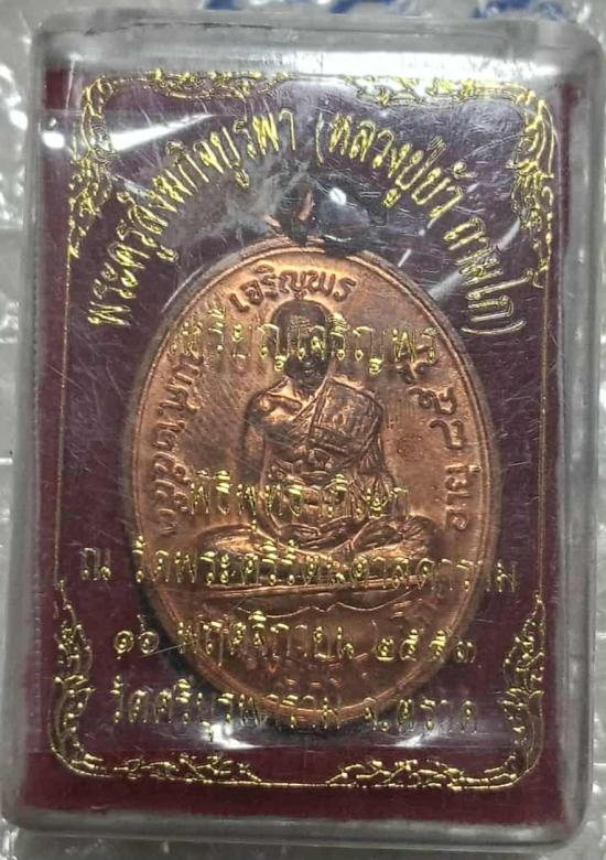เหรียญเจริญพรบน เนื้อทองแดง "บล็อคทองคำ" หลวงปู่บัวถามโก วัดศรีบุรพาราม จ.ตราด 16 พฤศจิกายน 2553 หมายเลข "3454" ครับ พร้อมกล่องเดิมครับ |