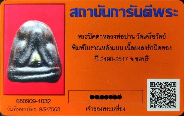 ปิดตาหลวงพ่อปาน วัดเครือวัลย์ ชลบุรี พิมพ์โบราณหลังแบบ เนื้อผงลงรักปิดทอง ปี 2490-2517 พระสวยครับแท้ดูง่าย พร้อมบัตรรับรอง... |