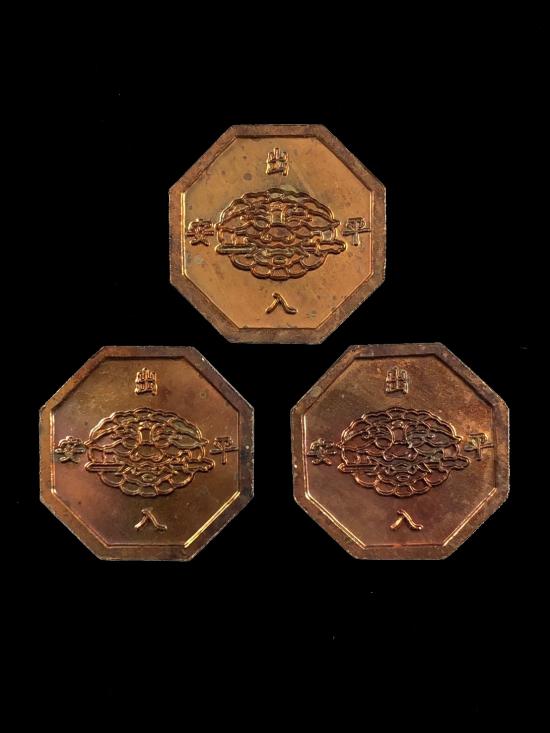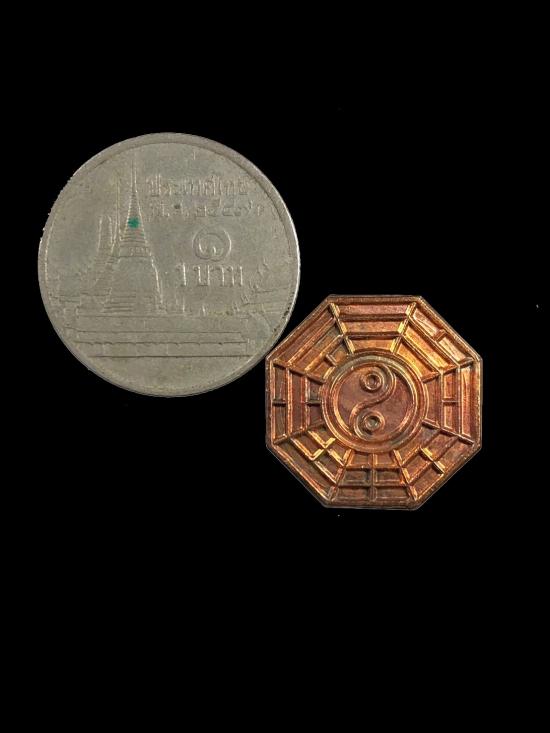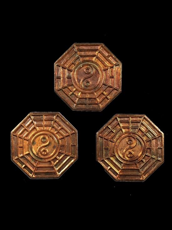 วัดใจ เคาะเดียว 130... เหรียญหยินหยางยันต์แปดทิศ หลังเสือคาบดาบ เนื้อทองแดง กันชงแก้ชง แก้ดวงไม่ดี วัดมังกร กทม. 3เหรียญ