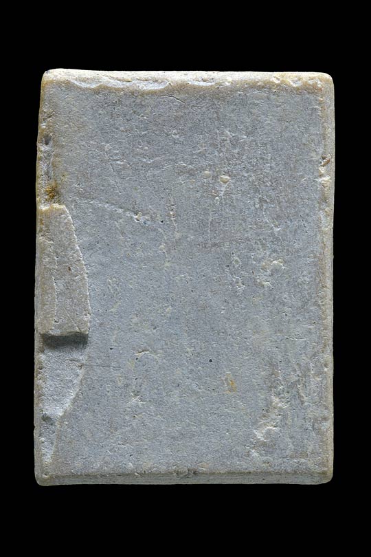 30.พระพิมพ์สามเหลี่ยม ปางประทานพร ด้านหน้ายันต์พุทโธ ด้านหลังยันต์เฑาะว์ เนื้อผงสีเทา ( คุณสุขสันต์ พรจินดา " โกหย่ง " ศิษย์วัดนครอินทร์ สร้างถวาย ประมาณราวๆ 2000 องค์ มีหลายๆองค์ ที่ฝังตะกรุดชายจีวร หลวงพ่อคูณ ขนาด ยาว 1.5 เซนติเมตร ความหนาเท่าๆก้านไม้ขีด ไว้ที่ขอบฐานด้านล่างขององค์พระ เพื่อความแตกต่างเลยผสมผงธูปเข้าไปด้วย สีขององค์พระเลยออกมาโทนสีเทา |