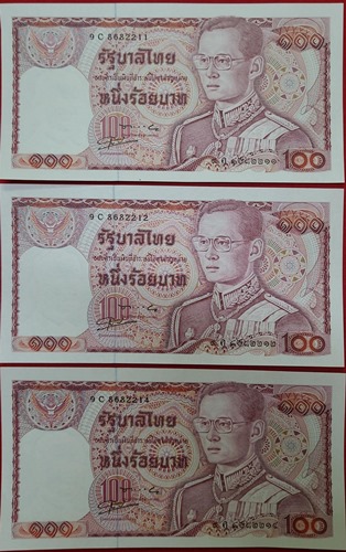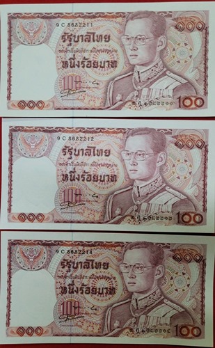 ธนบัตร 100 บาท ในหลวงรัชกาลที่ 9 แบบ 12 ด้านหลังช้างแดง จำนวน 3 ฉบับ สภาพ สวย,ใหม่,ไม่ผ่านการใช้ ลายเซ็น ประมวล - กำจร หมายเลข 9C8682211,8682212 และ 9C8682214