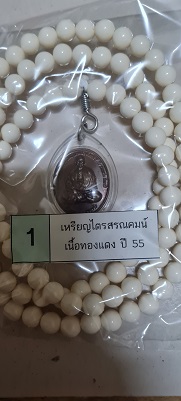 เหรียญไตรสรณคมน์ เนื้อทองแดง หลวงตาม้า วัดถ้ำเมืองนะ พร้อมรอยจารหลวงตาม้า เลี่ยมจากวัดพร้อมประคำ