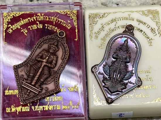 เหรียญหล่อ รุ่นรวยเงิน รวยทอง ที่ รฤก รศ 240 วัดจุฬามณี เนื้อทองแดงเถื่อน อีก 1 รุ่นคุ้มภ้ย เนื้อทองแดงมันปู รับพระ 2 องค์
