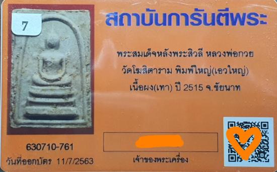 สมเด็จหลวงพ่อกวย ปี15 หลังพระสิวลี เนื้อผง(พิมพ์ใหญ่-เอวใหญ่) วัดโฆสิตาราม จ.ชัยนาท คราบกรุเดิมๆสวย พบเจอน้อยมากๆ พร้อมบัตรรับรองครับ |