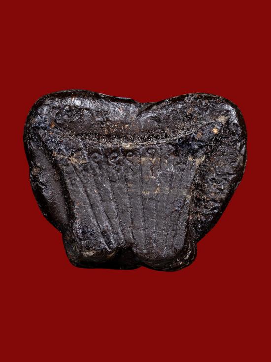 มีมวลสารแปะติดด้านหน้าน่าจะเป็นเป็นชานหมากติดไว้เก่าแห้งสนิท |