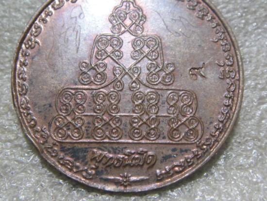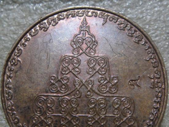 ช่องว่างระหว่างเหรียญลงจารมือด้วย อิสวาสุ หมายถึงหัวใจของพระพุทธเจ้าและตอกโค้ต ๙ หมายถึงความเจริญก้าวหน้าตลอดไปสำหรับผู้ใช้เหรียญนี้