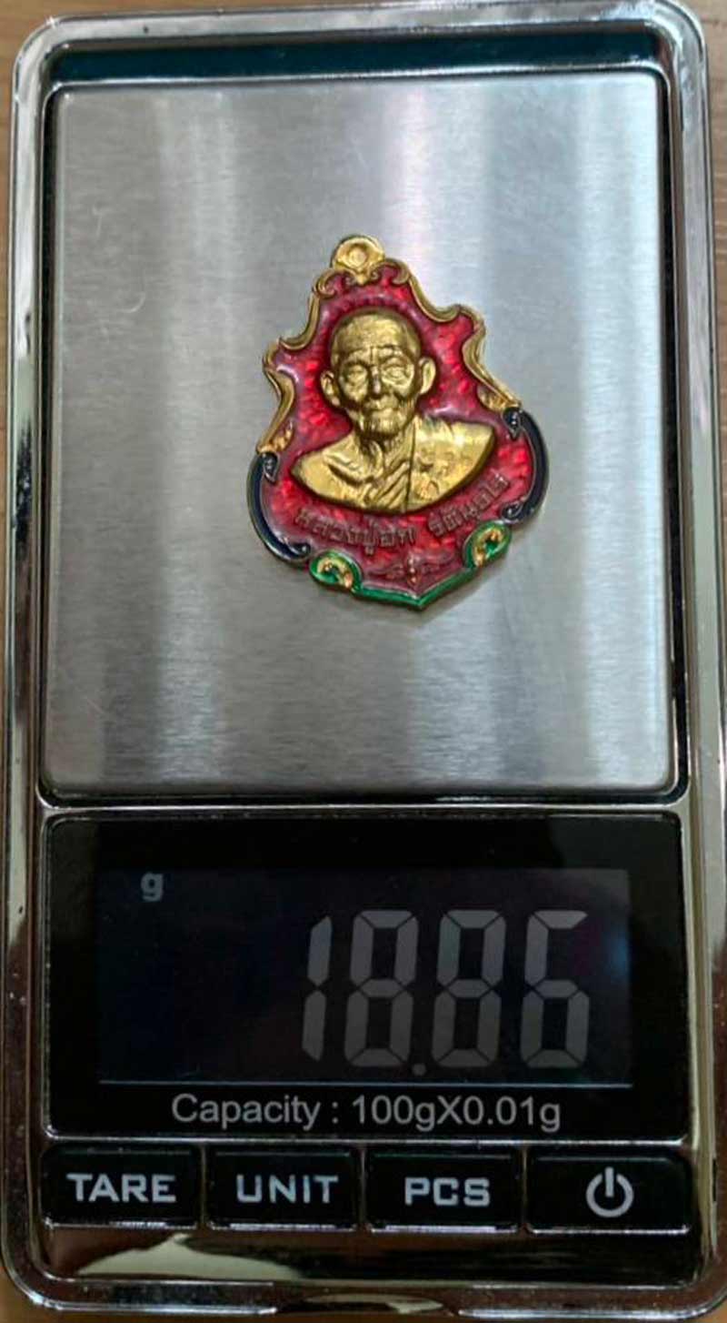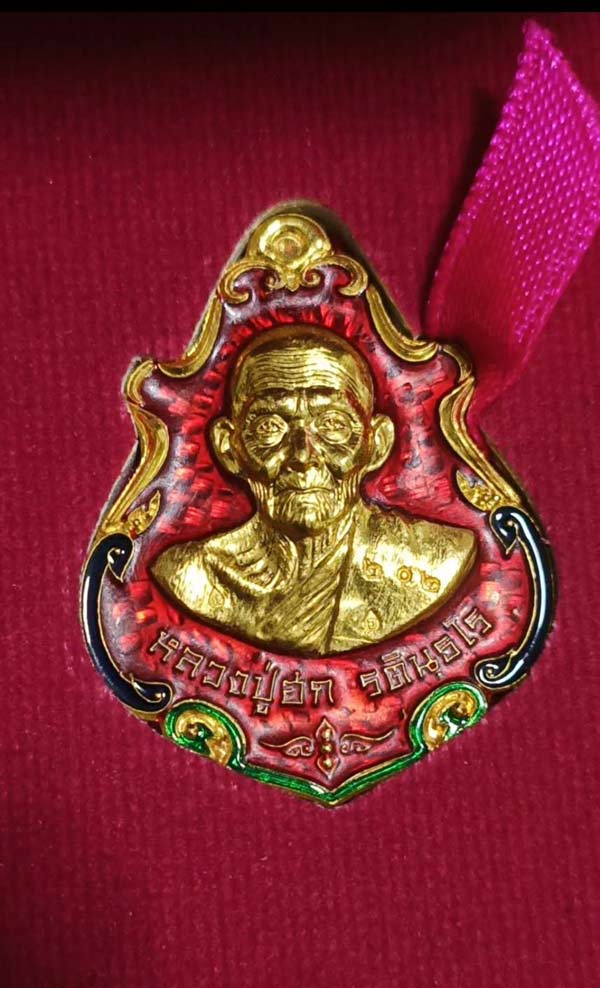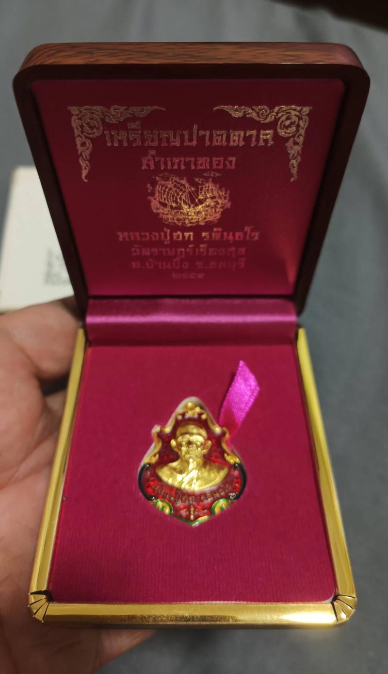 เหรียญปาดตาลสำเภาทอง หลวงปู่ฮก รตินธโร วัดราษฎร์เรืองสุข(วัดมาบลำบิด) ปี 58 ชลบุรี เนื้อทองคำ ลงยาสีแดง ตอกโค๊ต เลข 202