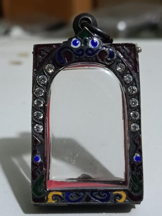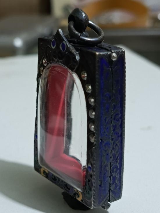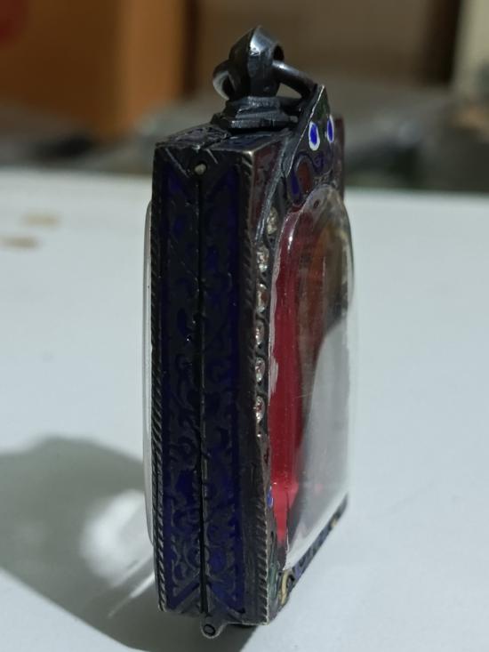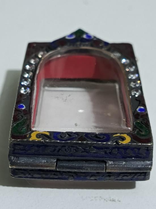 ตลับเงินลงยาเก่าฝังพลอย เปิดหลังแกะลาย. ลงยาร้อน หัวสิงห์ใหญ่ ใส่พระสมเด็จ.หนาหนัก 25.34 กรัม สวยสมบูรณ์ |