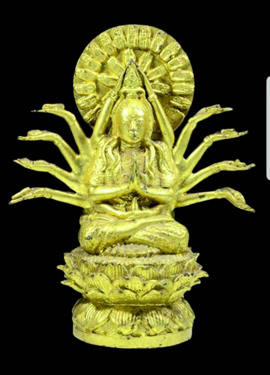 รูปหล่อเจ้าแม่กวนอิม ปางพันกร เนื้อโลหะผสมขนาดบูชา หน้าตัก3นิ้ว เนื้อหาเก่ามีศิลปะสวยปราณีต เช่าเหมามาแถวย่านเยาวราชหลายปีแล้วจำไม่ได้เจ้าของเดิมบอกว่าเช่ามาจากศาลเจ้าแม่กวนอิม ผ่านพิธีการปลุกเสกเบิกเนตรแล้ว ประมาณการสร้างที่เจ้าของบอกเช่ามาประมาณปี2515 เอาเป็นว่าปีนี้ใครทานเจ เคาะเจ้าแม่ไปบูชาจะช่วยเสริมดวงการเงิน การงาน การเรียน การค้าขาย และความรักให้ประสบผลสำเร็จดังพรที่ขอ |