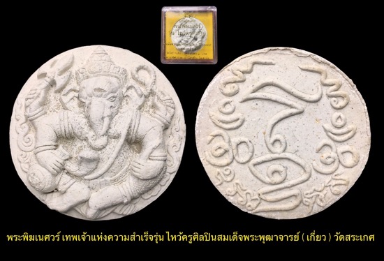 พระพิฆเนศวร์ เทพเจ้าแห่งความสำเร็จรุ่น ไหว้ครูศิลปินสมเด็จพระพุฒาจารย์ ( เกี่ยว ) วัดสระเกศ เป็นองค์ประธานจุดเทียนชัย ประกอบพิธีมหาพุทธา - เทวาภิเษก 3 วาระ1. วัดวรเชษฐาราม 2.ถ้ำฉัตรทัณ 3.วัดเขาอ้อ ขนาด 5 ซม