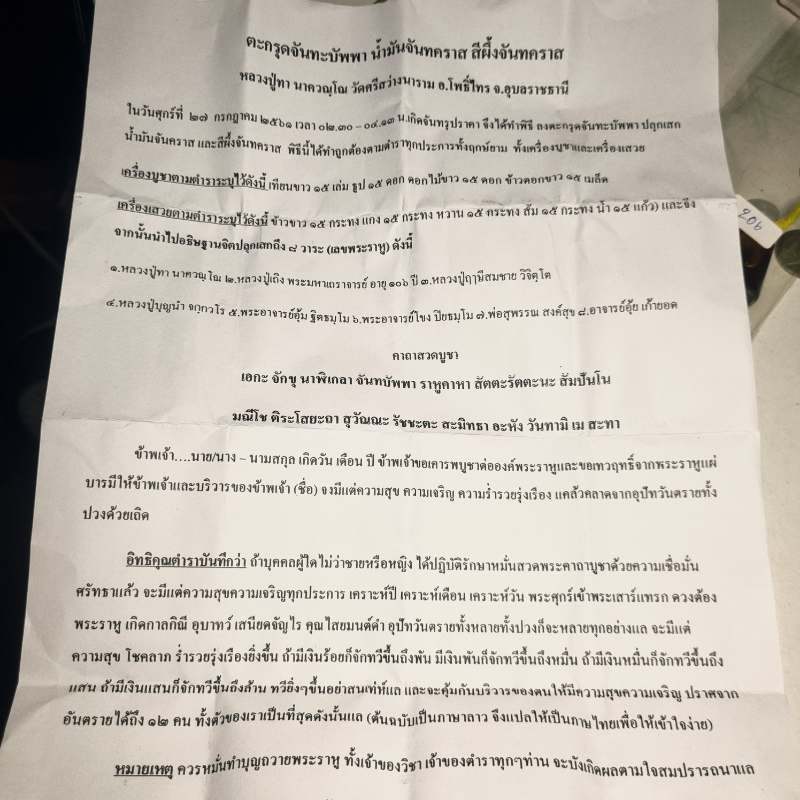#ได้ทำพิธี ลงตะกรุดจันทบัพพา ปลุกเสกน้ำมันจันคราส และสีผึ้งจันทคราส สำเร็จลุล่วงไปด้วยดี เสียดายเพียงแต่พอถึงเวลาท้องฟ้าปิดจึงไม่สามารถถ่ายภาพสวยให้ชมได้ พิธีนี้ได้ทำถูกต้องตามตำราทุกประการ โดยใช้เครื่องบูชาและเครื่องเสวยดังนี้