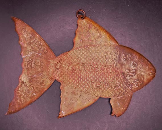 ชื่อพระเครื่อง !!!!วัดใจ 9 บาท!!!! ปลาตะเพียน (ประหยัด) แผ่นโลหะ มีห่วงแขวน ขนาด 4 นิ้ว ไม่ทราบที่ครับ...ป3