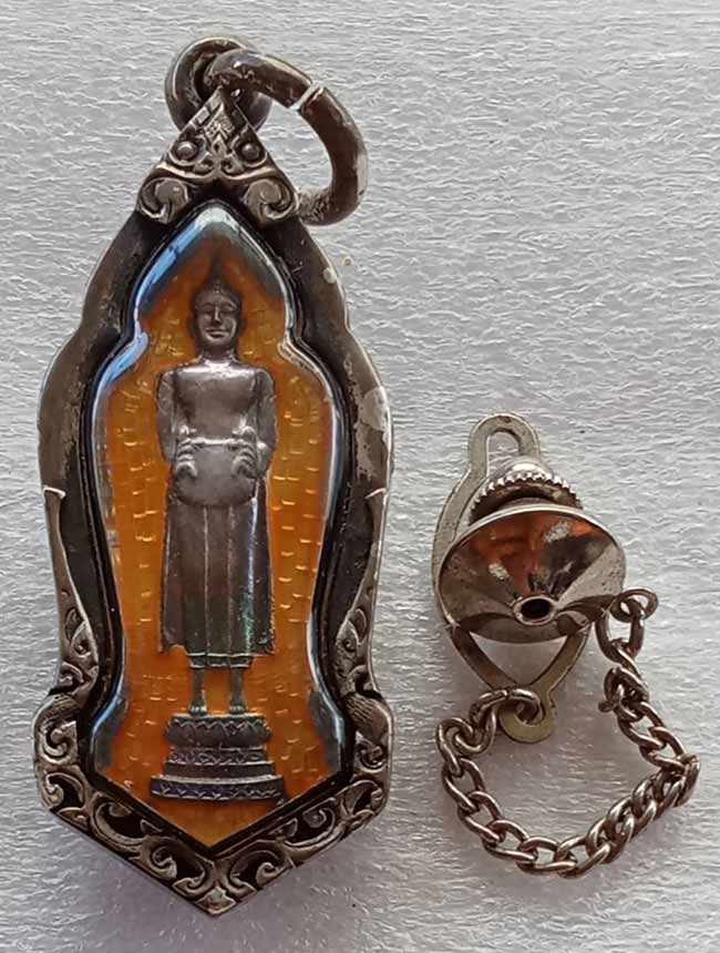เข็มกลัดเนื้อเงินลงยา กรรมการ รุ่นแรก (สีเหลือง วันจันทร์) หลวงพ่อแก่นจันทร์ วัดช่องลม ปี 2522 ราชบุรี เลี่ยมเงินสั่งตัด
