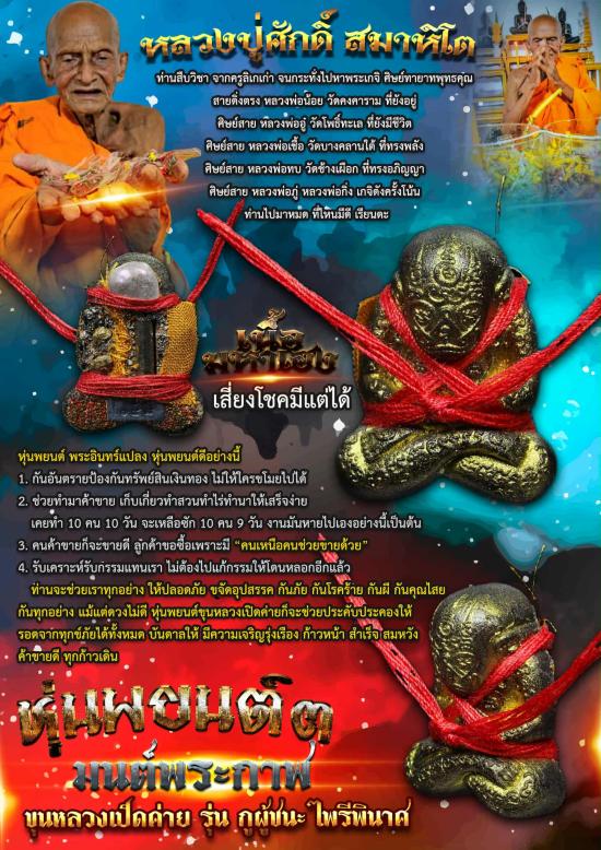 หลวงปู่ ท่านบอก ให้พกไป ใหญ่คับที่ คนเกรงใจ ไปไหนผ่านสะดวก มีชัย มีกำไลตลอดทาง ลูกหลานเอ่ย บูชาไว้เทิด หุ่นพ์ยฺนต์หลวงปู่สร้างให้ใช้ ไม่มีพิษ ไม่มีภัยต่อคนบูชา ไว้คุ้มครองตน ครอบครัว รถยนต์ บ้านเรือน..
