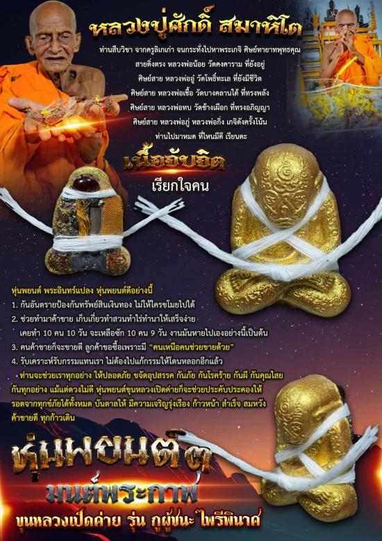 หลวงปู่ ท่านบอก ให้พกไป ใหญ่คับที่ คนเกรงใจ ไปไหนผ่านสะดวก มีชัย มีกำไลตลอดทาง ลูกหลานเอ่ย บูชาไว้เทิด หุ่นพ์ยฺนต์หลวงปู่สร้างให้ใช้ ไม่มีพิษ ไม่มีภัยต่อคนบูชา ไว้คุ้มครองตน ครอบครัว รถยนต์ บ้านเรือน..