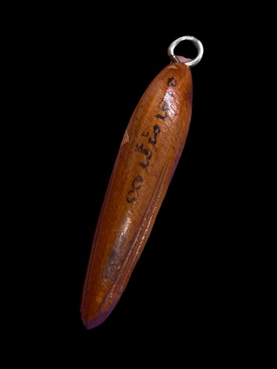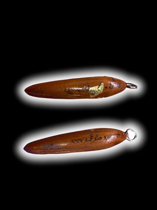 ***เครื่องรางเก่าโบราณทำจากไม้เนื้อแข็ง เรียวสวย ปิดทองบริเวณกลางลำ มีรอยจารอักขระและรอยหมึกเก่าชัดเจน สภาพยังสมบูรณ์ครบห่วงเดิม ปลุกเสกแนวสายเมตตาคงกระพัน