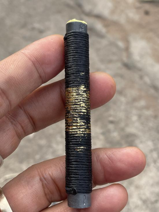 เป็นตะกรุดจารมือด้านในมีม้วนผ้าเหลือง ถักเชือกเทียนสีดำและปิดทอง มีตอกโค๊ตหัวท้ายกำกับทุกดอก |