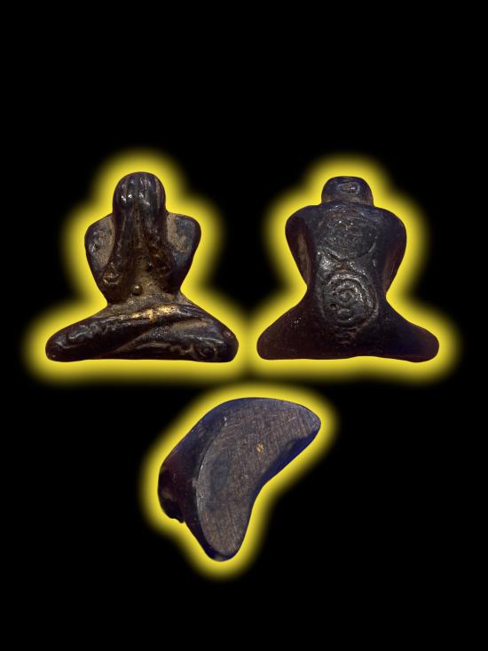 พระปิดตาแกะจากไม้เก่า องค์นี้เป็นของหายากมากในสายเครื่องราง เนื้อไม้มีอายุสูง ผิวแห้งธรรมชาติ มีรอยสัมผัสและการใช้จริงมานาน จุดเด่นคือรอยจารยันต์ด้านหลังและเม็ดมวลสารฝังในองค์ สื่อถึงการปลุกเสกแบบโบราณ องค์เล็กแต่เปี่ยมพลัง