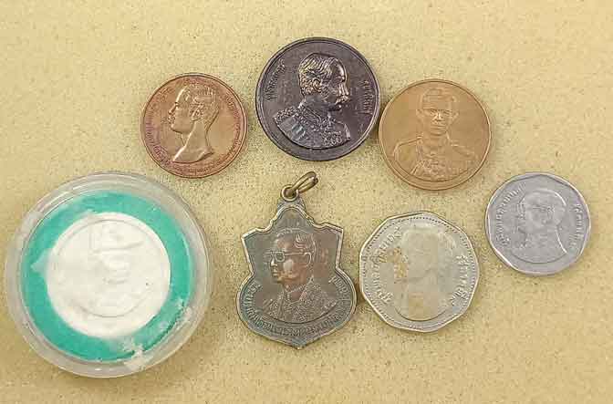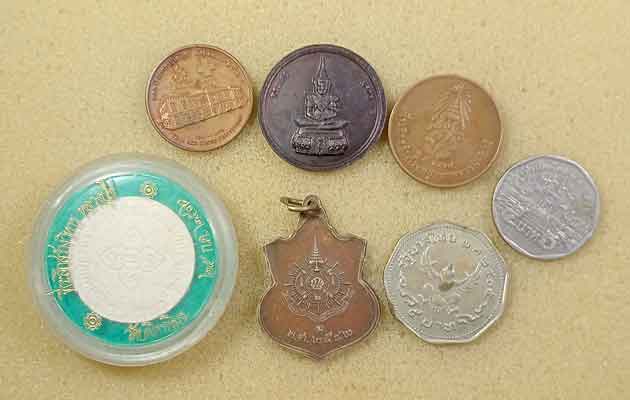 เหรียญร.5 2 เหรียญ + พระผงร.5+เหรียญร.9 2 เหรียญ + เหรียญ 5 บาท 2 เหรียญ |