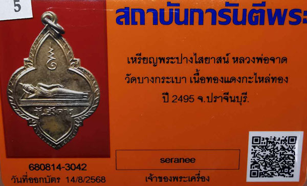 (วันอังคาร)เหรียญพระปางไสยาสน์ หลวงพ่อจาด วัดบางกระเบา เนื้อทองแดงกะไหล่ทอง ห่วงเดิม ปี2495 จ.ปราจีนบุรี + บัตรG-pra สภาพเดิมค่ะ