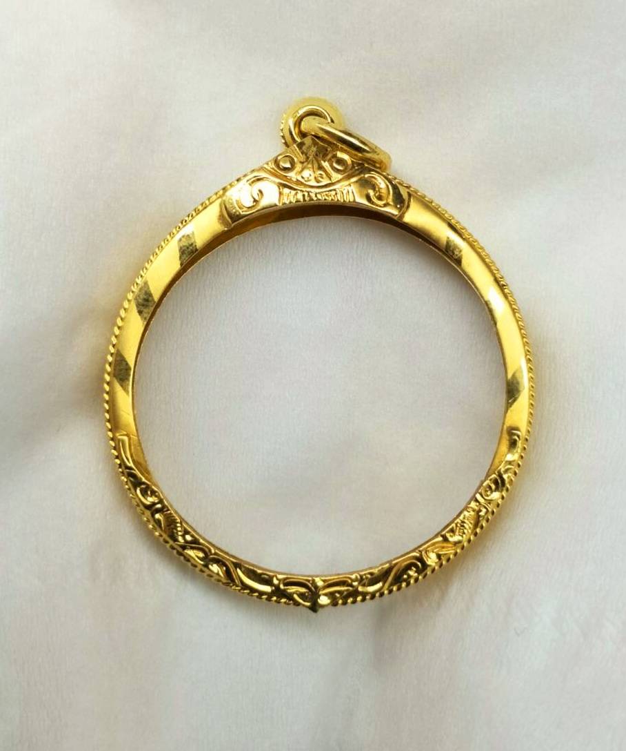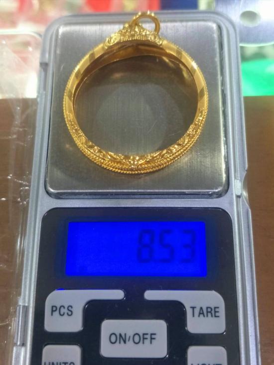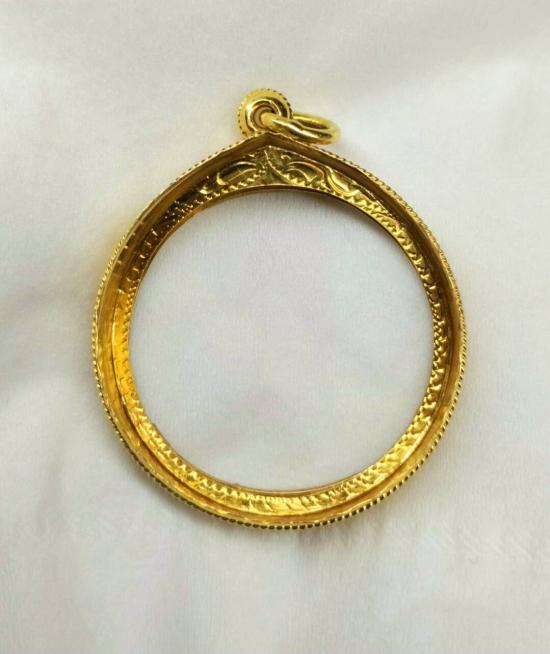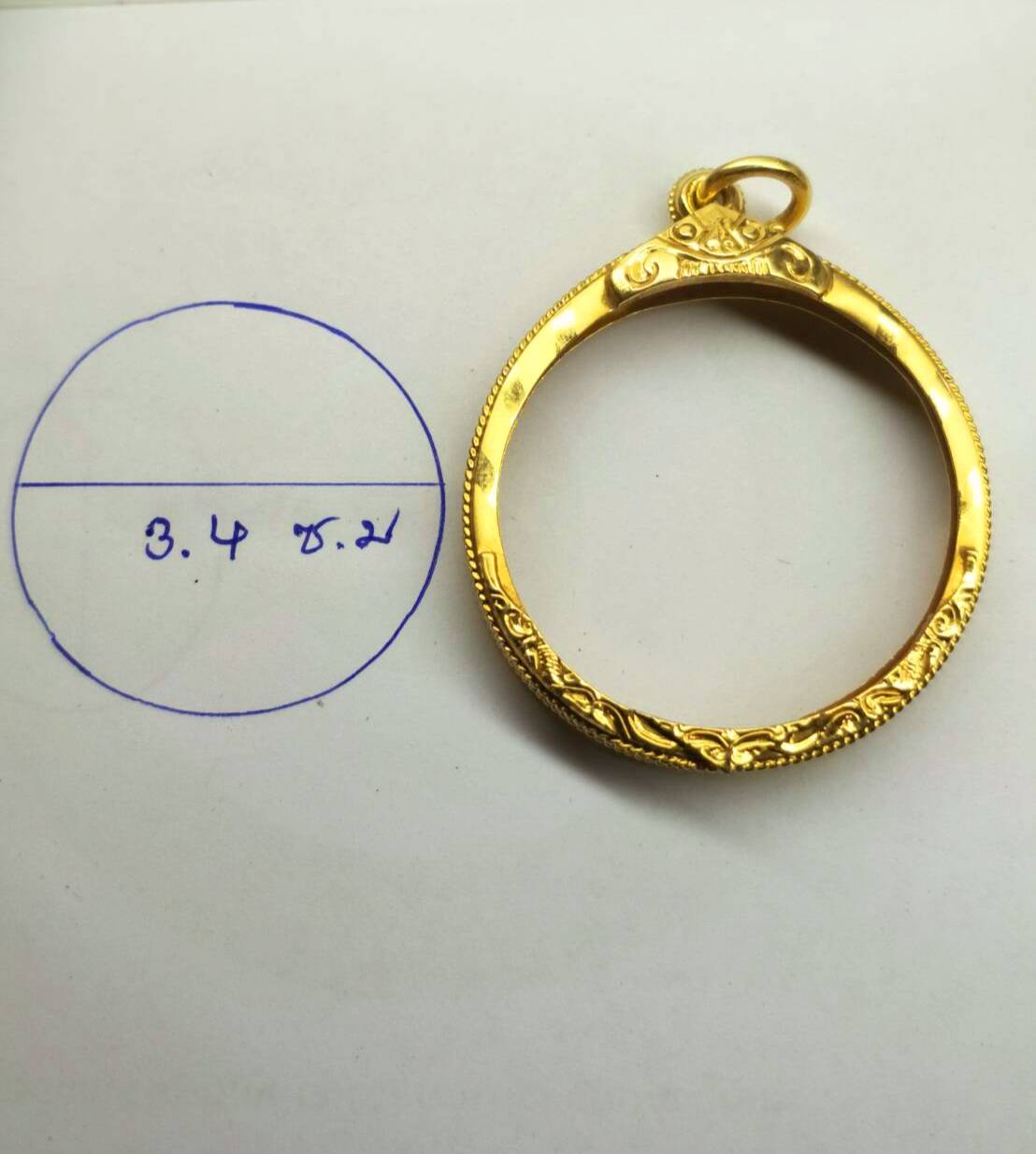 กรอบทองคำแท้ ทรงกลม (เส้นผ่าศูนย์กลาง 3.4 ซม.) น้ำหนักประมาณ 8.53 กรัม เปอร์เซ็นสูง