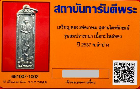 เหรียญพรหลวงปู่ รุ่นสมปราถนา เนื้อกะไหล่ทอง หลวงพ่อเกษม เขมโก ปี 2537 พร้อมบัตร G |
