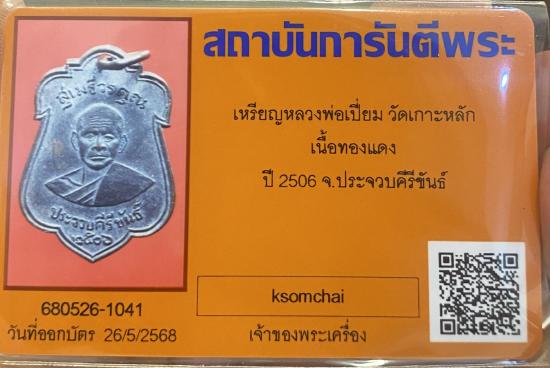 เหรียญหลวงพ่อเปี่ยม วัดเกาะหลัก เนื้อทองแดง ปี2506 จ.ประจวบคีรีขันธ์ พร้อมบัตรการันตี |