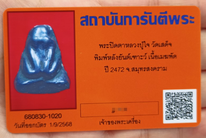 พระปิดตาหลวงปู่ใจ วัดเสด็จ เนื้อเมฆพัด พร้อมบัตรรับรอง