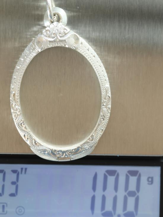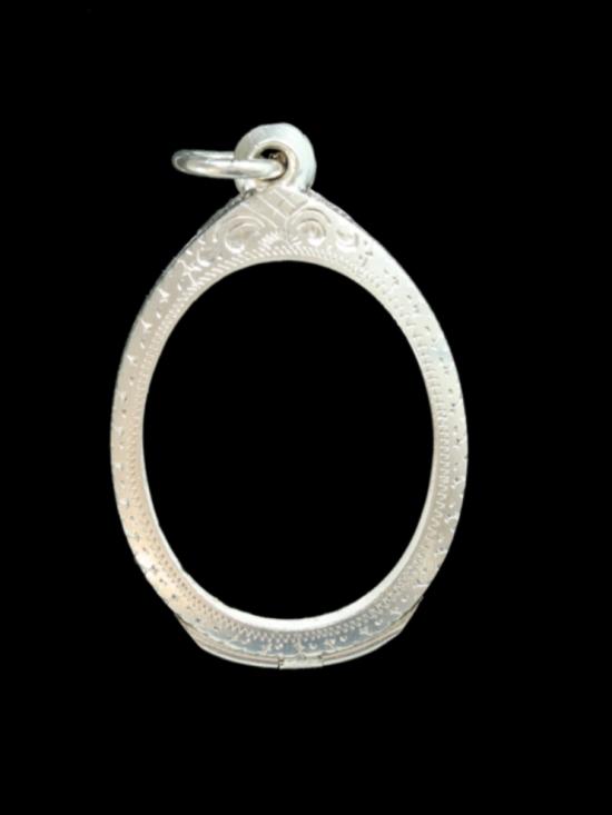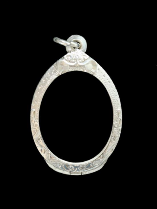 รายละเอียด กรอบเงินแกะมือยกซุ้ม มือสอง น้ำหนัก ๑๐.๘ กรัม วัดรอบวงในกว้าง ๒.๗ cm. สูง ๓.๕ cm. สภาพสวย