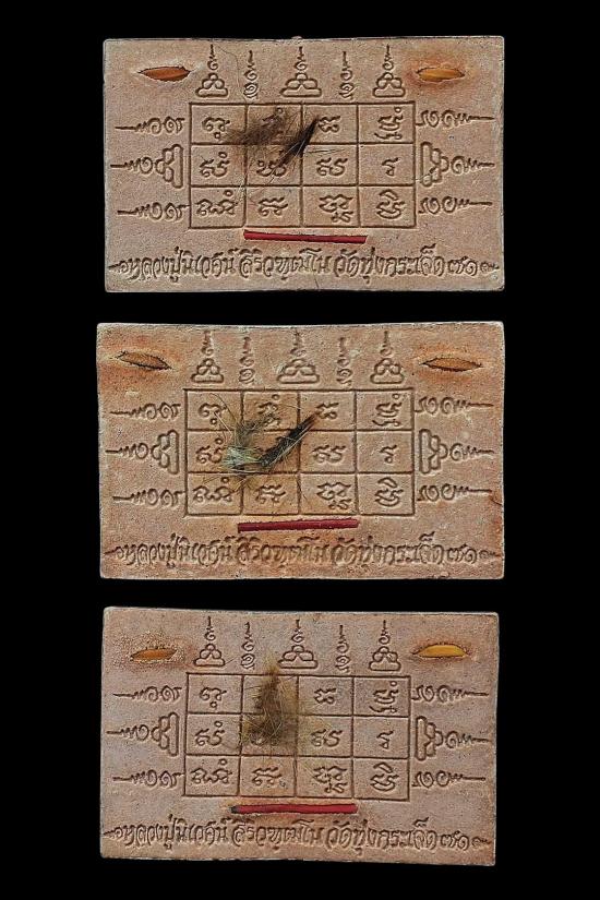 ชื่อพระเครื่อง ชุด 3 องค์...เสือนอนกินทรัพย์สินพูนทวี เนื้อผงว่านยาคลุกน้ำมันเสือ หลังโรยขนเสือ + เม็ดข้าวนารอด + ก้านธูปเสก ปี 2551 หลวงปู่นิเวศน์ วัดทุ่งกระเจ็ด จ.สุพรรณบุรี พร้อมซองรูปใบฝอยเดิมจากวัด