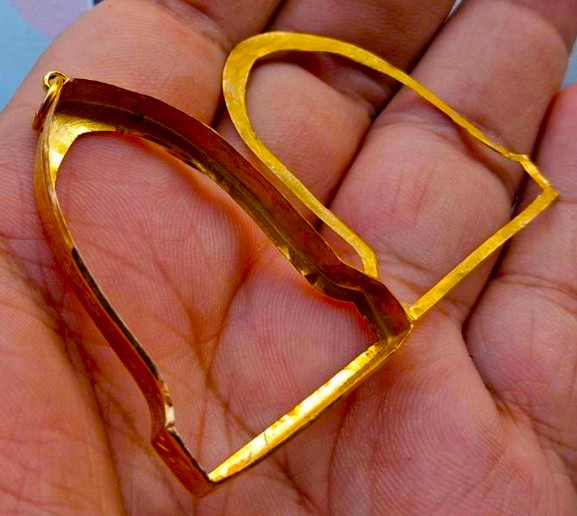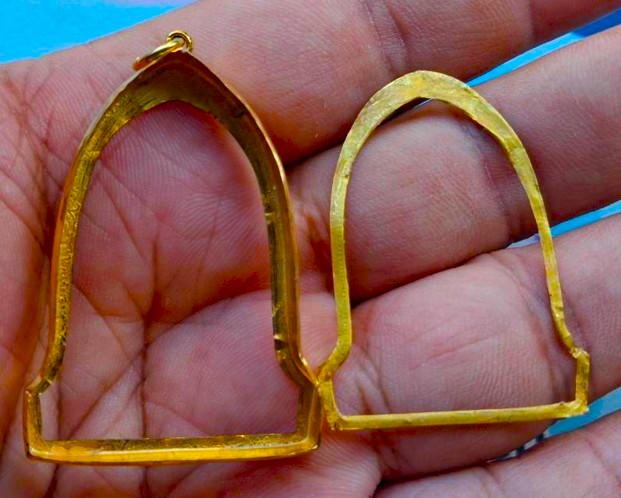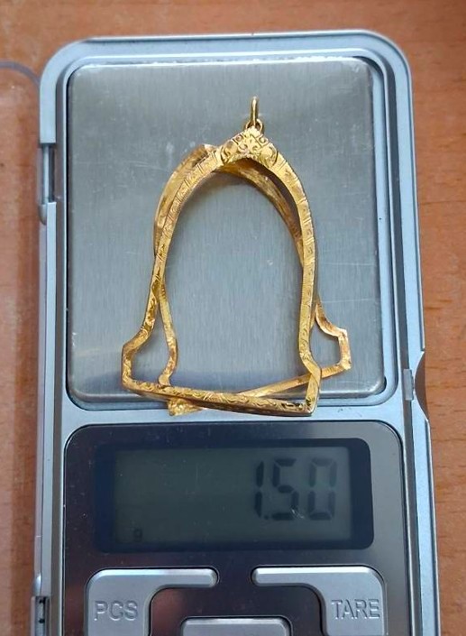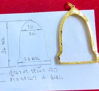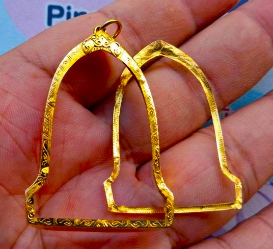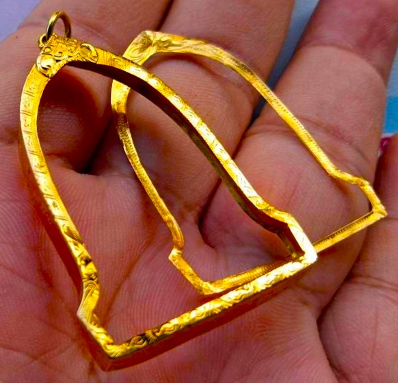 กรอบทองมือสอง ใส่เหรียญระฆังหลวงเกษม และสามารถใส่พระอื่นๆที่ไกล้เคียง หน้าจอด้านล่างกว้าง 2.6 ซม.,สูง 3.6 ซม. น้ำหนัก 1.50 กรัม เคาะเดียว