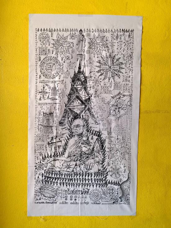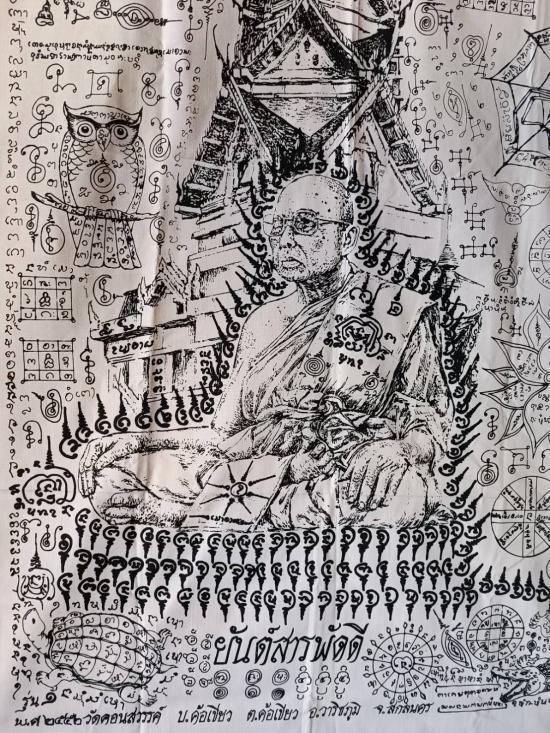 ผ้ายันต์นี้รวมยันต์ที่เป็นมงคลต่าง ๆ ของหลวงปู่แทบจะทั้งหมดหรือทั้งหมด มียันต์แมงมุม จระเข้ และยันต์นกฮูกที่เป็นเอกอุด้านลาภและเมตตา และมียันต์อื่น ๆ อีกมากมายครับ เรียกว่าผืนเดียวครบทุกด้าน และเป็นยันต์ที่รวมสุดยอดไว้ ถือว่าจะเป็นรุ่นสุดท้ายที่ท่านทำแบบนี้ก็ได้ครับ หลังจากนั้นไม่เห็นท่านอนุญาตให้ทำอีก ครับ ขนาดผ้ายันต์คือ 21x39นิ้ว โดยประมาณถือว่าเป็นผ้ายันต์ใหญ่ครับ จะใหญ่กว่าผืนปกติครับ ซึ่งปกติจะมีขนาดประมาณ 15x22นิ้วครับ