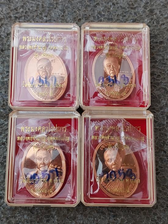 เหรียญเจริญพรบน รูปไข่ รุ่นแรก หลวงพ่อชำนาญ วัดชินวราราม จ.ปทุมธานี พิมพ์เครึ่งองค์ หลังพระพรหม(นิยม) 4 เหรียญ |