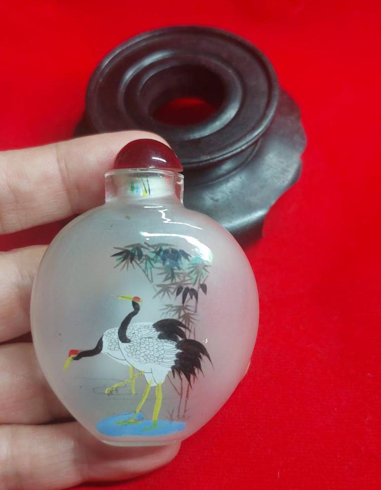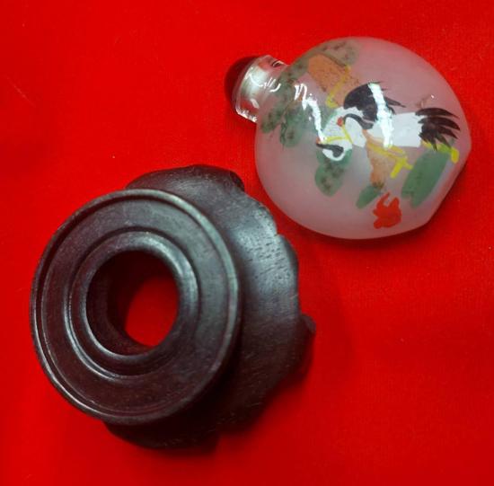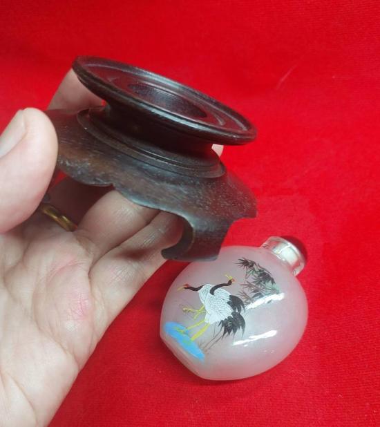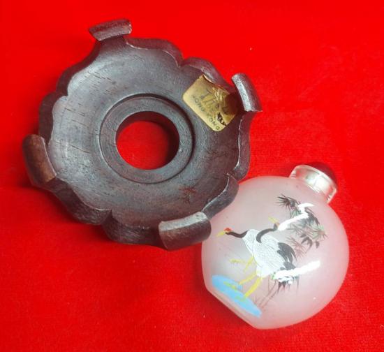 ฐานหรือกี๋ไม้ ชั้นวางของขนาดเล็ก สไตล์จีนMade in Hong Kong กับ ขวดแก้วเพ้นสี ขนาดเล็ก ของเก่าสะสม