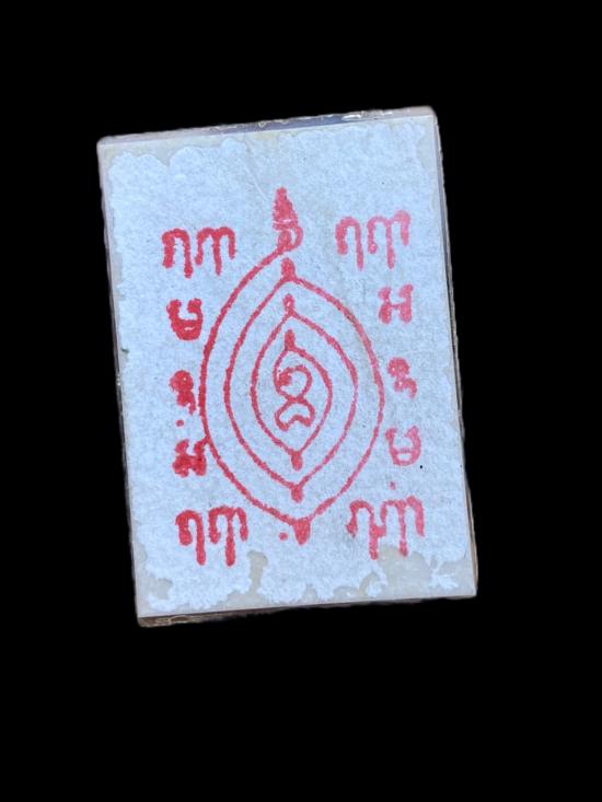 ด้านหลังลงยันต์สีแดงมือ บนพื้นกระดาษเดิม บ่งบอกพิธีเก่ามีครู
