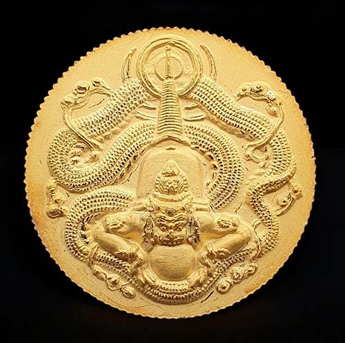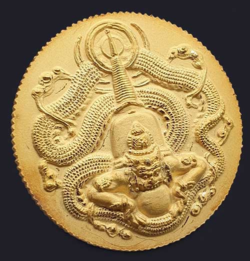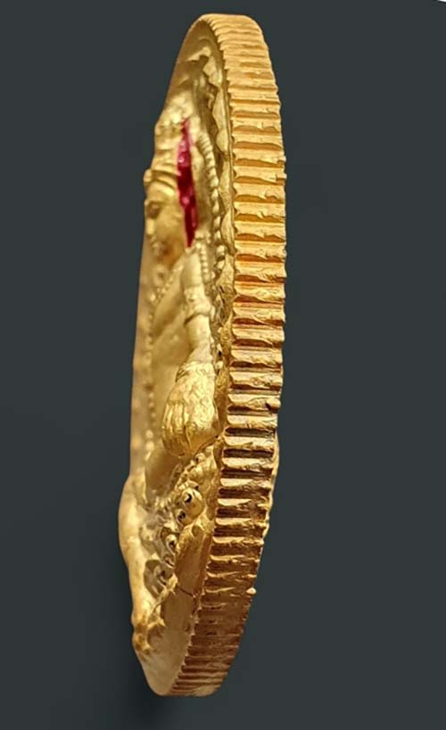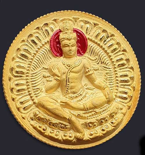 เหรียญองค์พ่อจตุคาม รุ่น รวยไม่เลิก เหรียญแจกศูนย์จอง ชุบทองพ่นทราย ลงยาแดง ขนาด 3.2 ซม. ไม่มีกล่อง |