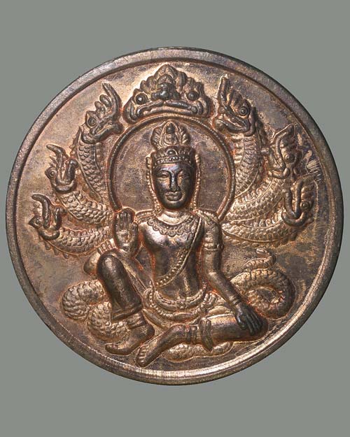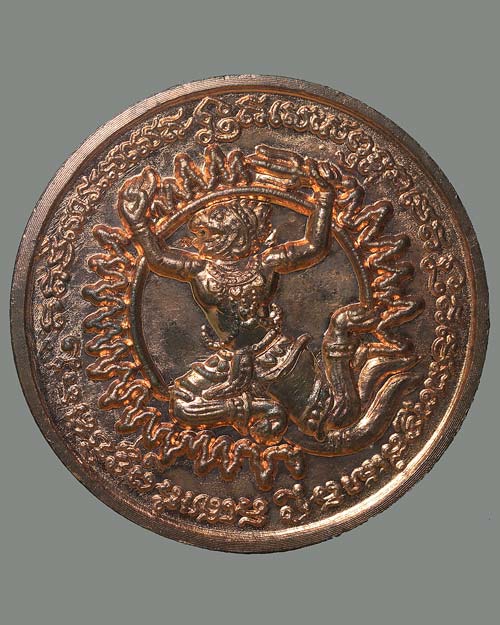 เหรียญบาตรน้ำมนต์พระเทวราชโพธิสัตว์จตุคามรามเทพ หลัง พญาชิงชัย รุ่นจักรพรรดิมหาราช 2550 เนื้อทองแดง 5.5 CM.