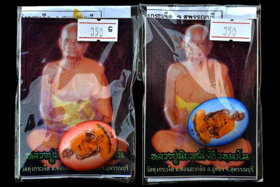 ชุด 2 องค์...ล็อกเก็ตอธิษฐานสมปรารถนา รุ่นแรก ฉากน้ำเงิน + ฉากแดง หลังบรรจุผงมวลสาร + สิงห์แกะ + ตะกรุดเงินตอกโค๊ต + แร่ศักดิ์สิทธิ์ ปี 2551 หลวงปู่นิเวศน์ วัดทุ่งกระเจ็ด จ.สุพรรณบุรี พร้อมซองรูปใบฝอยเดิมจากวัด สภาพพระตามรูปที่ลงทุกประการ (ขนาดประมาณ 3.4 x 2.5 ซม.)